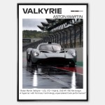 Plakat przedstawia Aston Martin Valkyrie w dynamicznym ujęciu, eksponując jego agresywną sylwetkę, aerodynamiczne przetłoczenia i imponujące tylne skrzydło. Valkyrie symbolizuje perfekcję inżynieryjną, ekstremalną moc i zaawansowane technologie, które definiują nowoczesną motoryzację hipersamochodów.