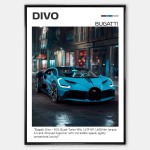 Plakat przedstawia Bugatti Divo w dynamicznym ujęciu, eksponując jego agresywne linie nadwozia, rozbudowane wloty powietrza oraz charakterystyczne tylne skrzydło. Divo symbolizuje perfekcję inżynieryjną, ekstremalną moc i nowoczesną estetykę hiperauta, które łączy sportową wydajność z elegancją.