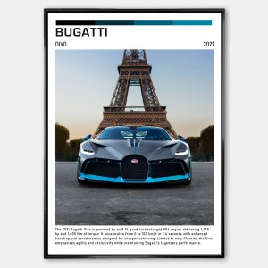 Plakat przedstawia Bugatti Divo w dynamicznym ujęciu, eksponując jego agresywne linie nadwozia, charakterystyczne wloty powietrza i imponujące tylne skrzydło. Divo symbolizuje perfekcję inżynieryjną, ekstremalną moc i nowoczesną estetykę hiperauta, które łączy sportową wydajność z elegancją.
