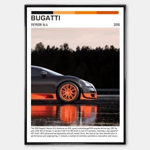 Plakat przedstawia Bugatti Veyron 16.4 w dynamicznym ujęciu, eksponując jego aerodynamiczną sylwetkę, charakterystyczne linie nadwozia oraz detale karbonowe. Veyron 16.4 symbolizuje perfekcję inżynieryjną, ekstremalną moc i luksus, który definiuje współczesne supersamochody.