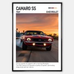 Ten plakat samochodowy Chevrolet Camaro SS przedstawia legendarny model muscle cara w dynamicznym ujęciu. Podkreśla charakterystyczną sylwetkę, muskularne linie nadwozia i detale SS, które uczyniły Camaro symbolem amerykańskiej motoryzacji i samochodów sportowych.