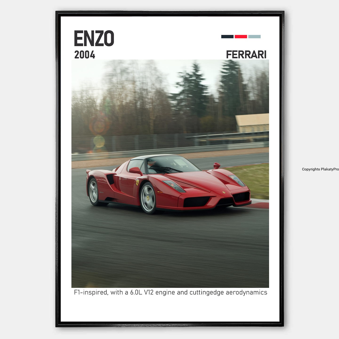 Plakat przedstawia Ferrari Enzo w dynamicznym, pełnym mocy ujęciu, które oddaje jego agresywną sylwetkę, aerodynamiczne linie i charakter rodem z toru wyścigowego. Enzo to symbol przełomu technologicznego, innowacji i bezkompromisowej wydajności.