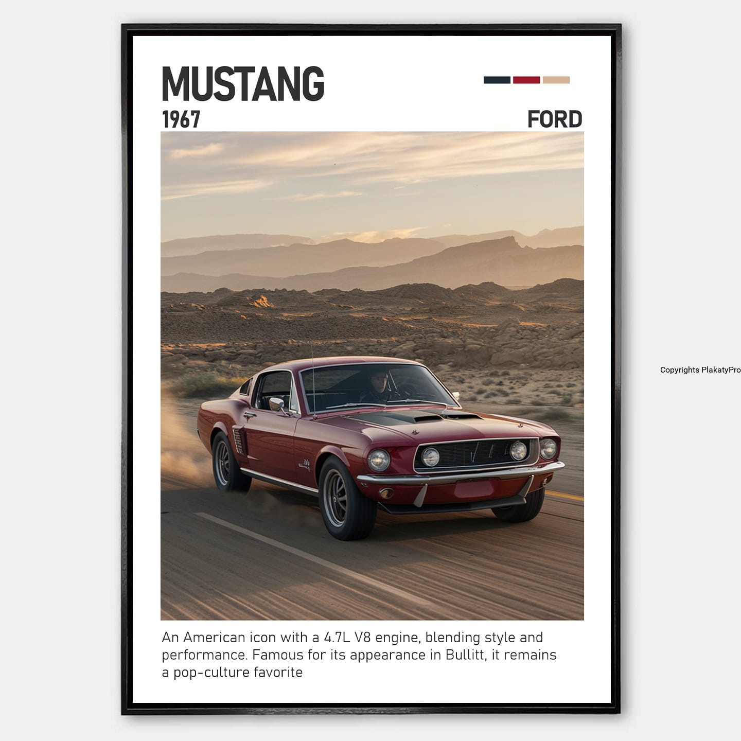 Odkryj Ford Mustang w formie wyjątkowego plakatu – symbol amerykańskiej mocy, stylu i kultowego designu muscle carów. Ten plakat samochodowy to idealna dekoracja dla fanów klasycznych aut, kolekcjonerów i miłośników motoryzacyjnej historii. Mustang od lat zachwyca charakterystycznym wyglądem, potężnym silnikiem i legendarnym statusem wśród samochodów sportowych.