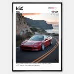 Plakat przedstawia Honda NSX w dynamicznym ujęciu, podkreślając jej aerodynamiczną sylwetkę, agresywne linie nadwozia i sportowy charakter. NSX to samochód, który symbolizuje japońską precyzję, technologię i pasję do czystej jazdy.