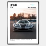 Plakat przedstawia Koenigsegg Jesko w dynamicznym, agresywnym ujęciu, podkreślając jego futurystyczną linię nadwozia, sportowe proporcje i aerodynamiczne detale. To model, który łączy ekstremalne osiągi, luksus i nowoczesną inżynierię w jednym wyjątkowym supersamochodzie.
