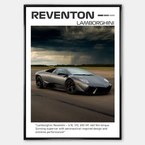 Odkryj Lamborghini Reventón w formie wyjątkowego plakatu – supersamochodu, który łączy ekstremalną moc, futurystyczny design i wyjątkową ekskluzywność. Ten plakat samochodowy podkreśla unikalny charakter Reventóna – agresywną sylwetkę, inspirowaną awiacją, oraz legendarną włoską precyzję w projektowaniu supersamochodów.