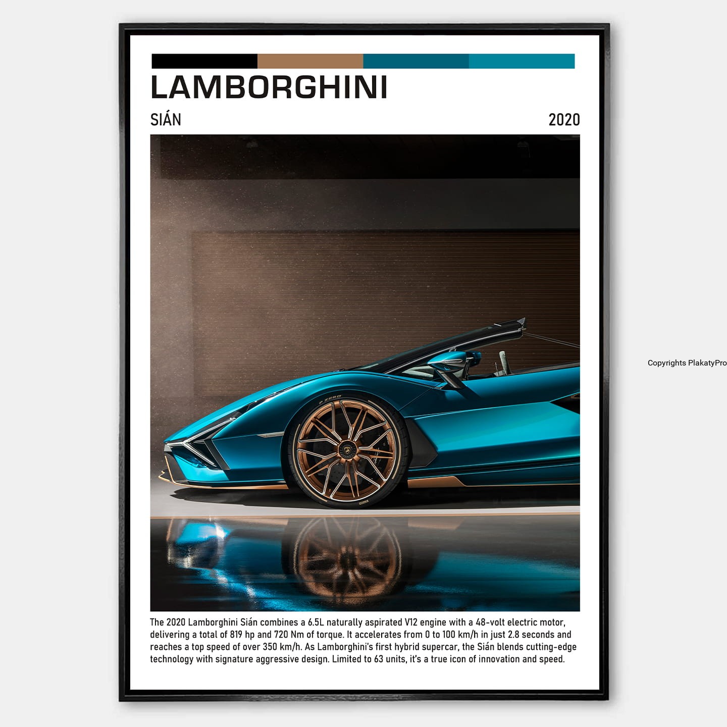 Plakat przedstawia Lamborghini Sián w dynamicznym ujęciu, eksponując jego agresywną sylwetkę, aerodynamiczne linie nadwozia oraz charakterystyczne detale karbonowe. Sián symbolizuje perfekcję inżynieryjną, ekstremalną moc i nowoczesną estetykę supersamochodów Lamborghini.