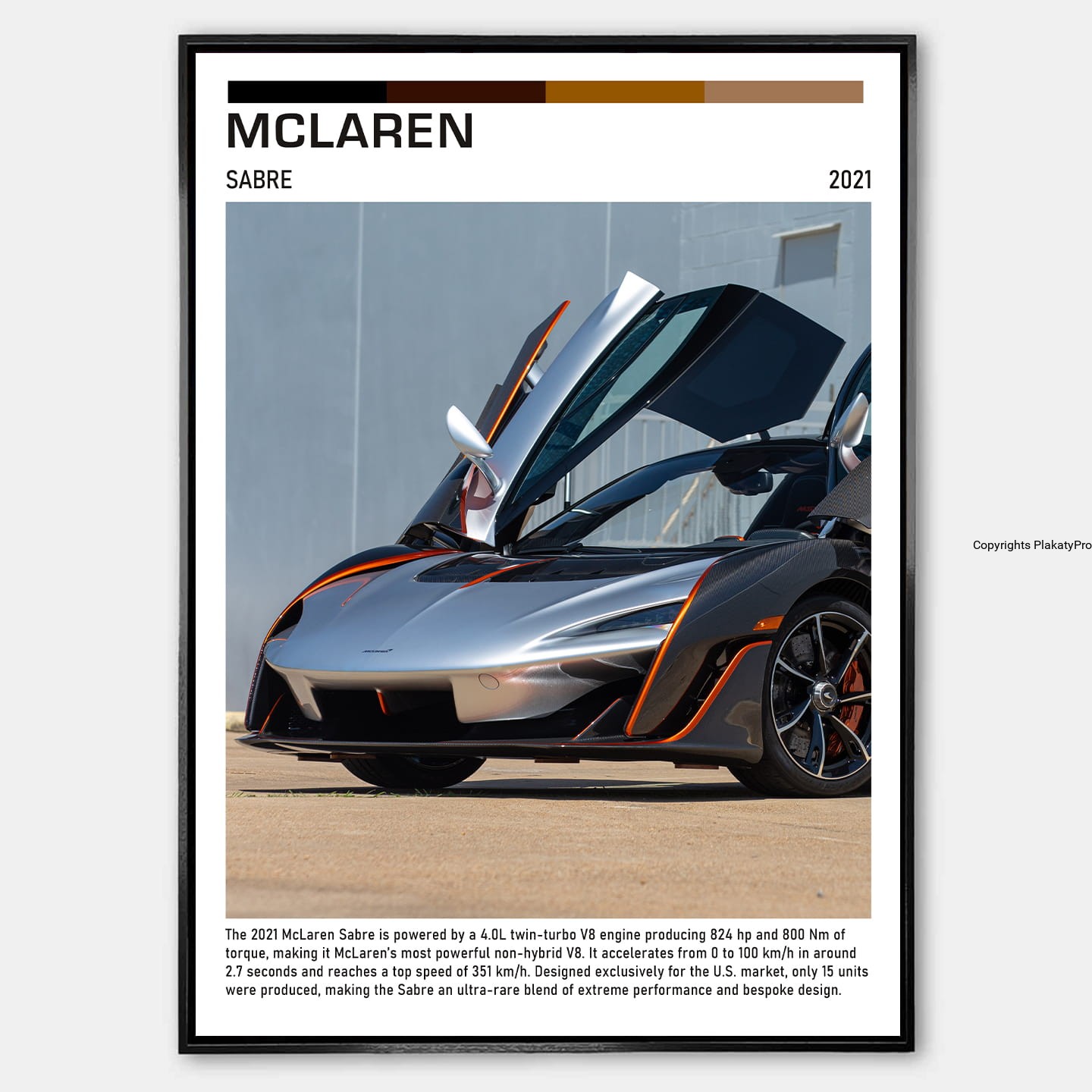 Plakat przedstawia McLaren Sabre w dynamicznym ujęciu, eksponując jego aerodynamiczną sylwetkę, charakterystyczne przetłoczenia nadwozia i detale karbonowe. Sabre symbolizuje perfekcję inżynieryjną, ekstremalną moc i innowacyjne technologie, które definiują współczesne supersamochody McLaren.