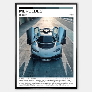 Plakat przedstawia Mercedes-AMG One w dynamicznym ujęciu, eksponując jego aerodynamiczną sylwetkę, charakterystyczne przetłoczenia nadwozia i detale karbonowe. AMG One symbolizuje perfekcję inżynieryjną, ekstremalną moc i innowacyjne technologie rodem z Formuły 1.