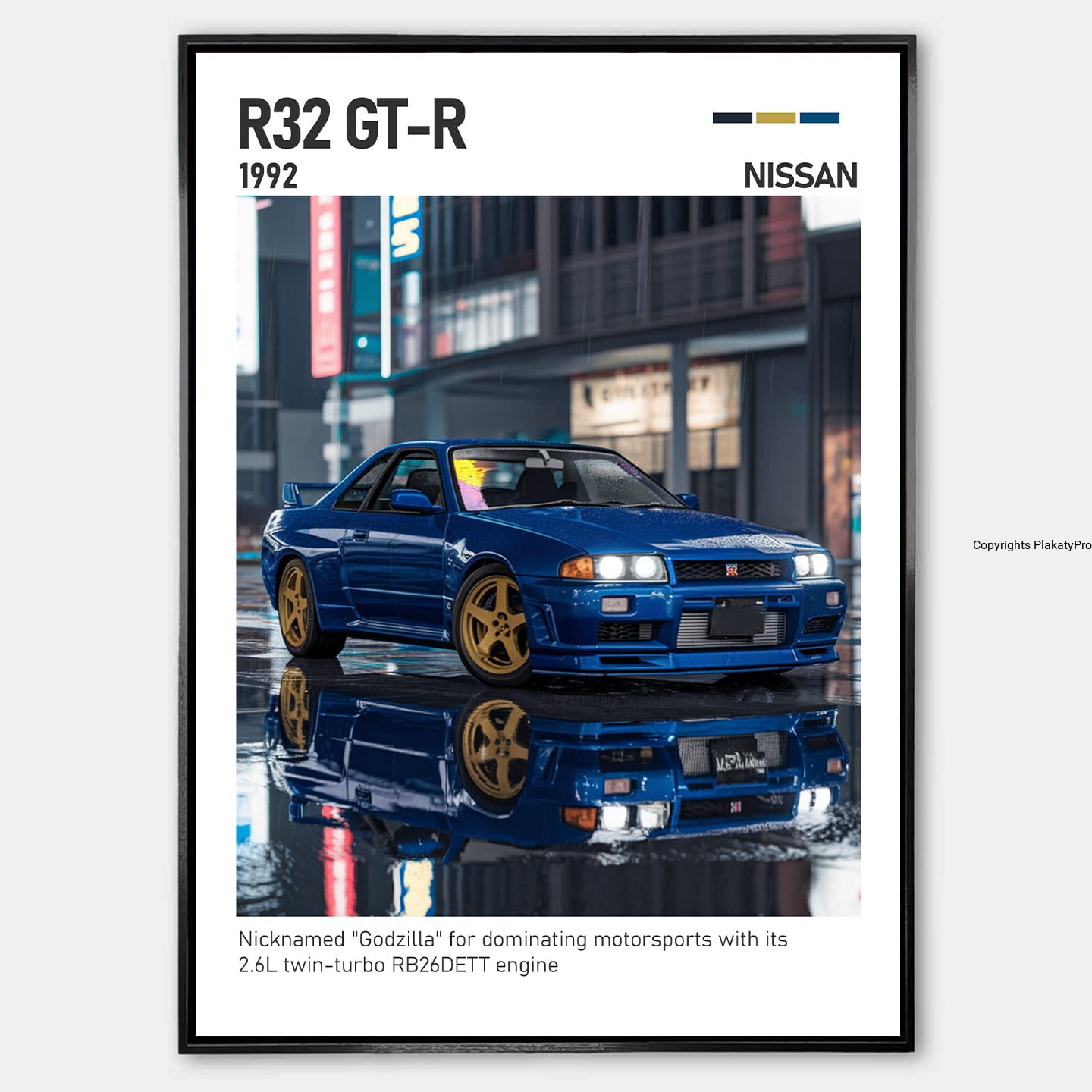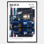 Plakat przedstawia Nissan Skyline GT-R R32 w dynamicznym, sportowym ujęciu, podkreślając jego szerokie nadwozie, charakterystyczne reflektory i aerodynamiczne linie. To samochód, który symbolizuje japońską precyzję, ekstremalne osiągi i legendarny charakter GT-R.