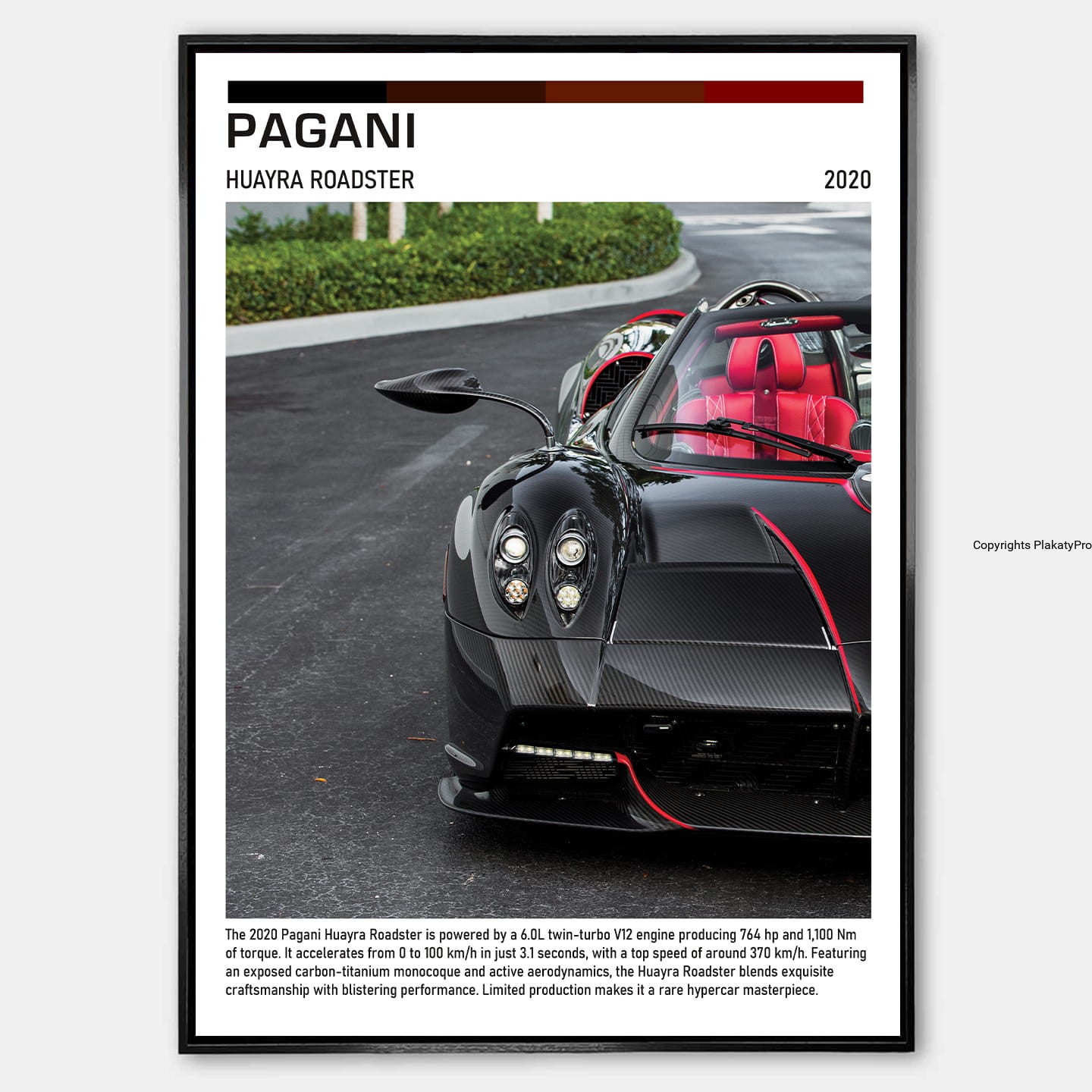 Plakat przedstawia Pagani Huayra Roadster w dynamicznym ujęciu, eksponując jego aerodynamiczną sylwetkę, charakterystyczne przetłoczenia nadwozia i detale karbonowe. Huayra Roadster symbolizuje perfekcję inżynieryjną, ekstremalną moc i unikalny włoski styl supersamochodów Pagani.