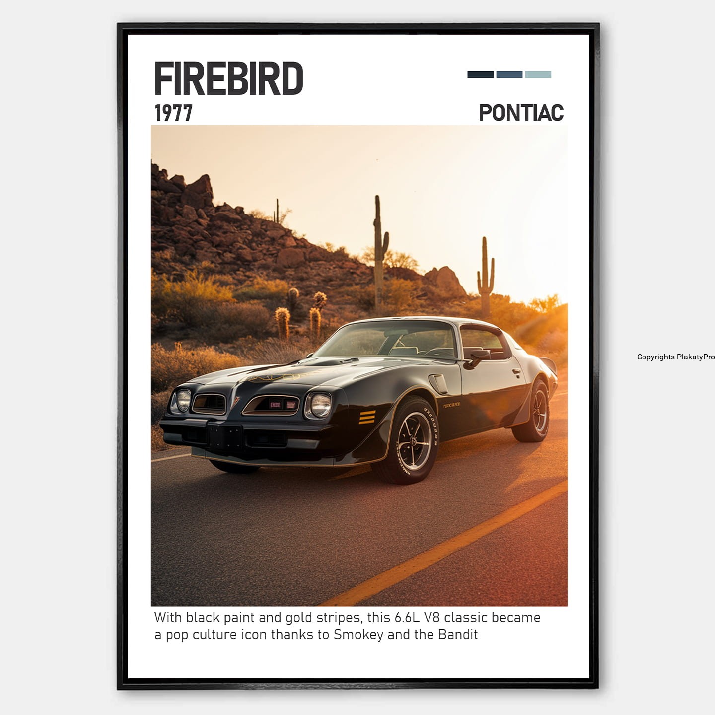 Plakat przedstawia Pontiac Firebird Trans Am w dynamicznym, kultowym ujęciu, podkreślając jego szerokie nadwozie, charakterystyczny przód i agresywne linie. To samochód, który symbolizuje wolność, moc i amerykański charakter muscle carów.