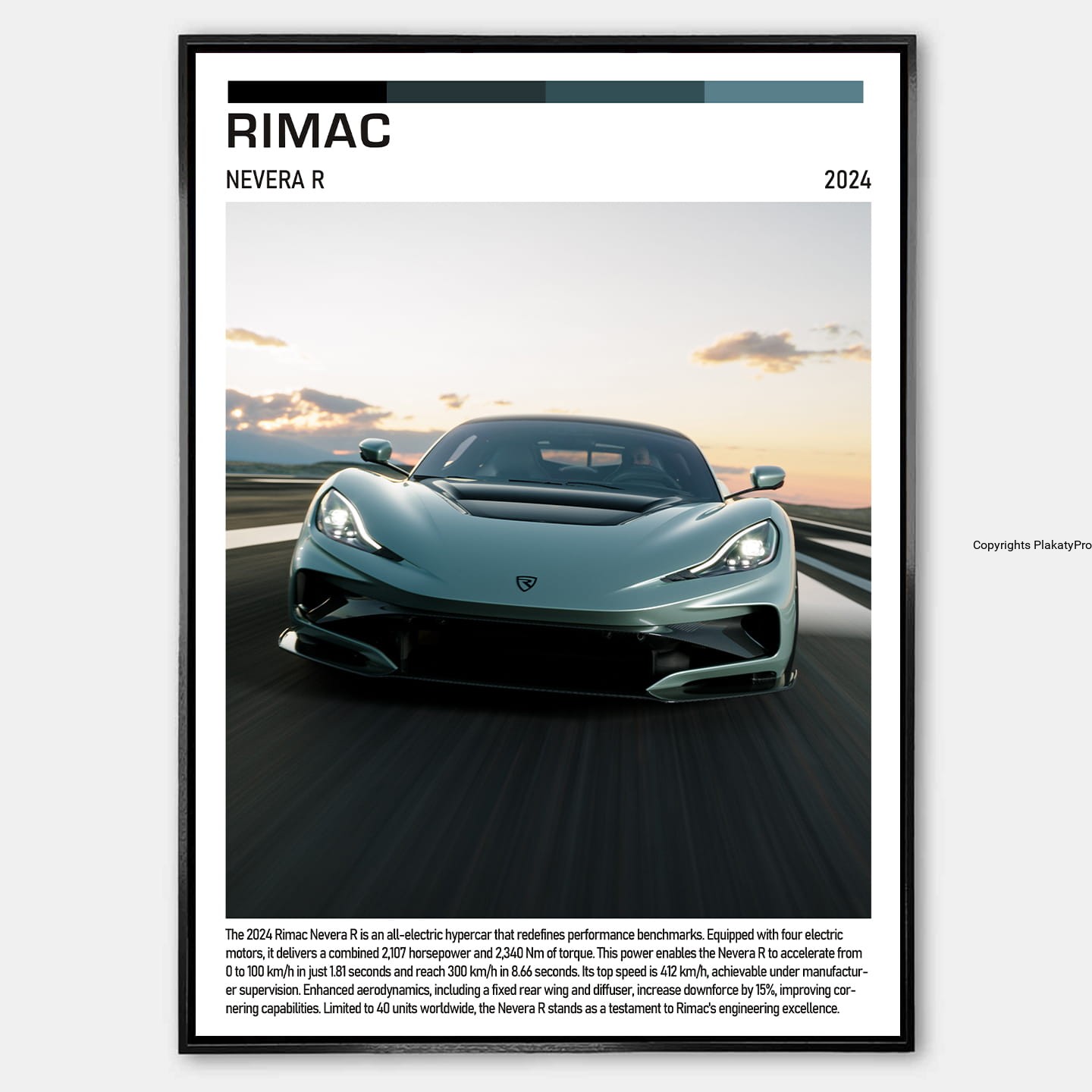 Plakat przedstawia Rimac Nevera R w dynamicznym ujęciu, eksponując jego aerodynamiczną sylwetkę, charakterystyczne przetłoczenia nadwozia i detale karbonowe. Nevera R symbolizuje perfekcję inżynieryjną, ekstremalną moc elektrycznego napędu i nowoczesny design supersamochodów Rimac.