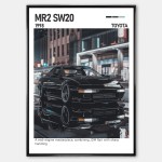 Plakat przedstawia Toyota MR2 SW20 w dynamicznym ujęciu, podkreślając jego charakterystyczną sylwetkę, aerodynamiczne linie nadwozia i unikalny styl. To samochód, który symbolizuje lekkość konstrukcji, precyzję japońskiej inżynierii i legendarny charakter MR2 SW20.