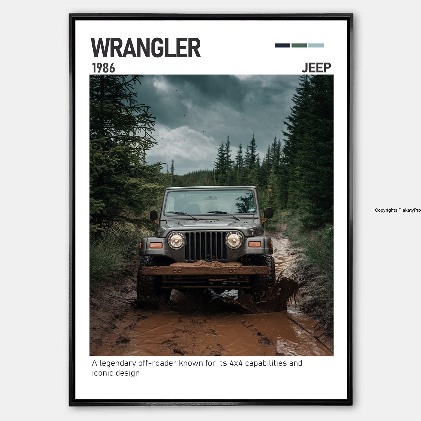 Plakat przedstawia Jeep Wrangler w dynamicznym, terenowym ujęciu, podkreślając jego muskularną sylwetkę, szerokie koła i kultowe detale nadwozia. To model, który od lat pozostaje symbolem wolności, przygody i off-roadowego charakteru.
