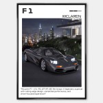 Plakat przedstawia McLaren F1 w dynamicznym ujęciu, eksponując jego centralnie umieszczone siedzenie kierowcy, aerodynamiczną sylwetkę oraz charakterystyczne otwory wentylacyjne. To samochód symbolizujący perfekcję inżynieryjną, lekkość konstrukcji i legendarną prędkość, która do dziś inspiruje miłośników supersamochodów.