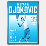 Plakat przedstawia Novaka Djokovicia w dynamicznej akcji – z charakterystycznym wyrazem skupienia, w trakcie jednego ze swoich potężnych uderzeń. Kompozycja ukazuje jego energię, atletyzm i precyzję, a detale nawiązujące do jego sukcesów i momentów chwały nadają mu unikalny charakter.