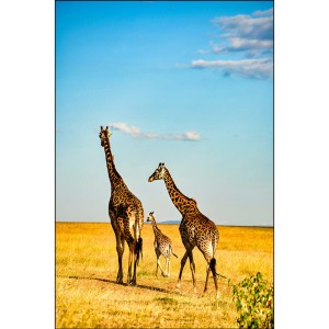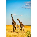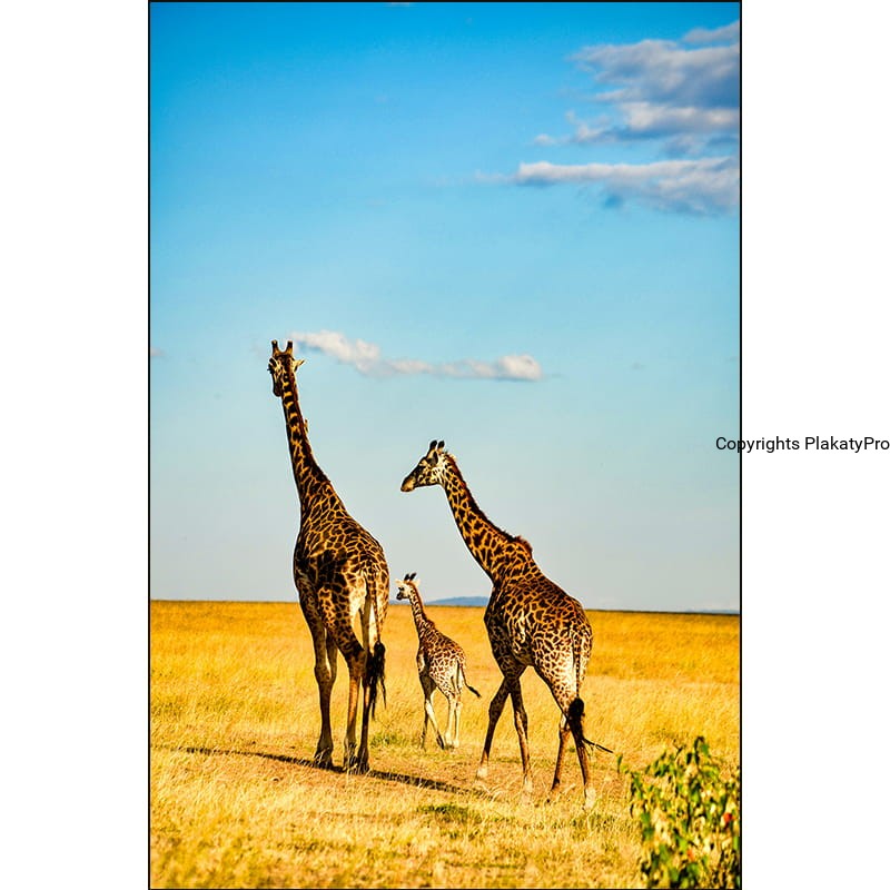 Grupa żyraf spokojnie przemierzająca sawannę pod gorącym afrykańskim słońcem. Dorosłe osobniki i młode – razem, w rytmie natury, symbolizując więzi, troskę i bliskość. Ten plakat to opowieść o rodzinie, dzikiej wolności i harmonii z otaczającym światem.